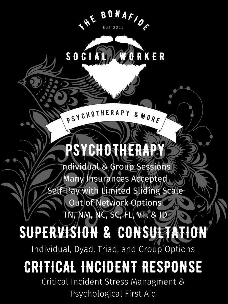 Although focused on flexible remote therapy serving clients in TN, NM, NC, SC, FL, VT, and ID there are plans for running in-person groups in the Bonafide Wellness Collective Flex Space. - LCSW Supervision & Case Consultation: