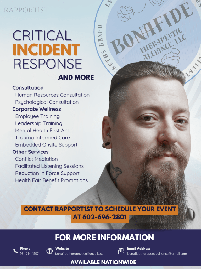 Custom trainings and partnership opportunities with local wellness businesses and nonprofits to strengthen community well-being. - Critical Incident Stress Management (CISM) & Psychological First Aid (PFA):