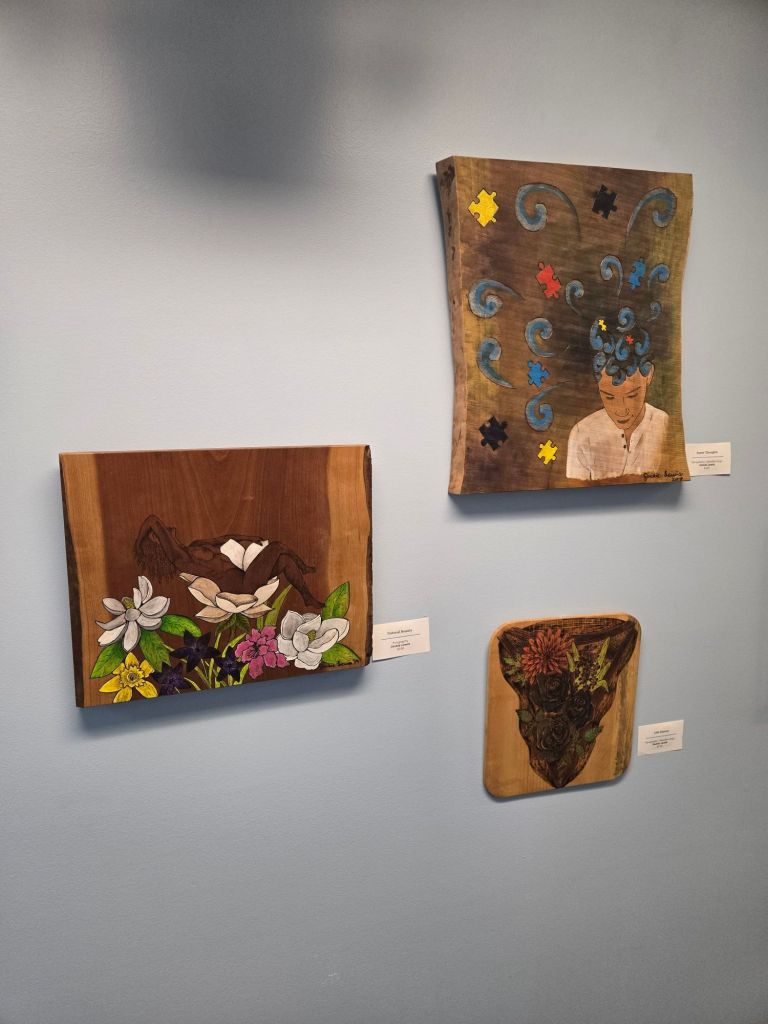 Jackie Lewis is a pyrography, mixed media artist, and graphic designer based in Clarksville, Tennessee. Working with reclaimed wood, she creates emotionally driven works that explore nature, trauma, and personal transformation. With a background in architecture and continued studies in graphic design at Austin Peay State University, her work blends traditional woodburning with abstract painting and digital elements. She has exhibited across Tennessee and beyond, earning multiple awards, including honors at the Clarksville Riverfest Juried Art Show and DAC Annual Juried Exhibition. She is also the founder of Clarksville Art Scene, a platform for promoting local artists.